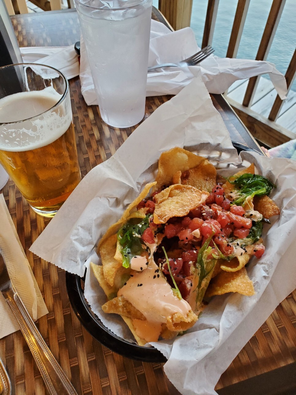에피타이저로 시킨 포케 타코! 미국인들 Sea weed라면 극혐하던데 여기는 일본식으로 미역같은게 들어가있었다. 타코는 맛있는데 일본식 미역무침이 내 스타일 아님😬